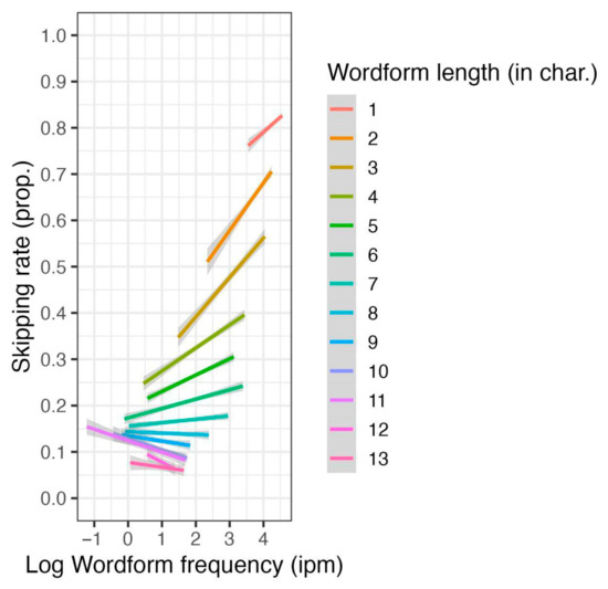 The effect of wordform frequency and word length interaction on skipping rate.
