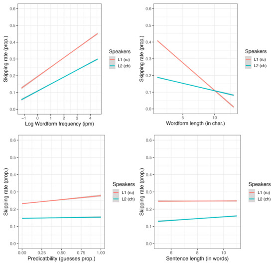Length and wordform frequency significantly interacted—short and frequent words were the most probable to be skipped (see Figure 3). The reader group factor (L1 or L2) significantly interacted with word length, wordform frequency, predictability, and sentence length (see Figure 4). Long, low-frequency words were particularly difficult for L2 readers, whereas—as the separate analyses confirmed—predictability had a significance only for L1 readers.