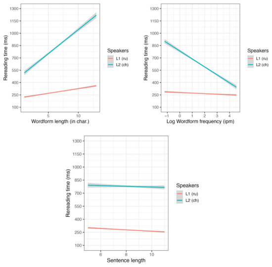 In the L1 group (see Appendix A, Table A8), we found significant effects of word length and sentence length on rereading time, with shorter words and words in longer sentences requiring less rereading time. For L2 readers (see Appendix A, Table A9), the “big three” effects were significant. However, we found no significant main effect of the duration of studying Russian, nor any interactions involving this variable.