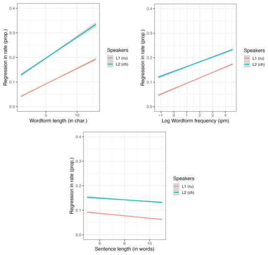 We analyzed data from both L1 and L2 reading using a combined model and found that all the “big three” factors significantly influenced regression rates (see Appendix A, Table A10). Notably, the effect of wordform frequency was in the opposite direction that expected: regression rates were higher for more frequent wordforms. Additionally, L2 readers exhibited significantly more regressions than L1 readers. The effects of word length, wordform frequency, and sentence length significantly interacted with the reader group (see Figure 6).