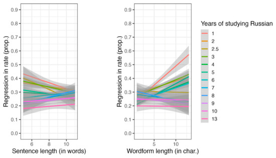 The interactions between word length and the duration of studying Russian, and sentence length and the duration of studying Russian.