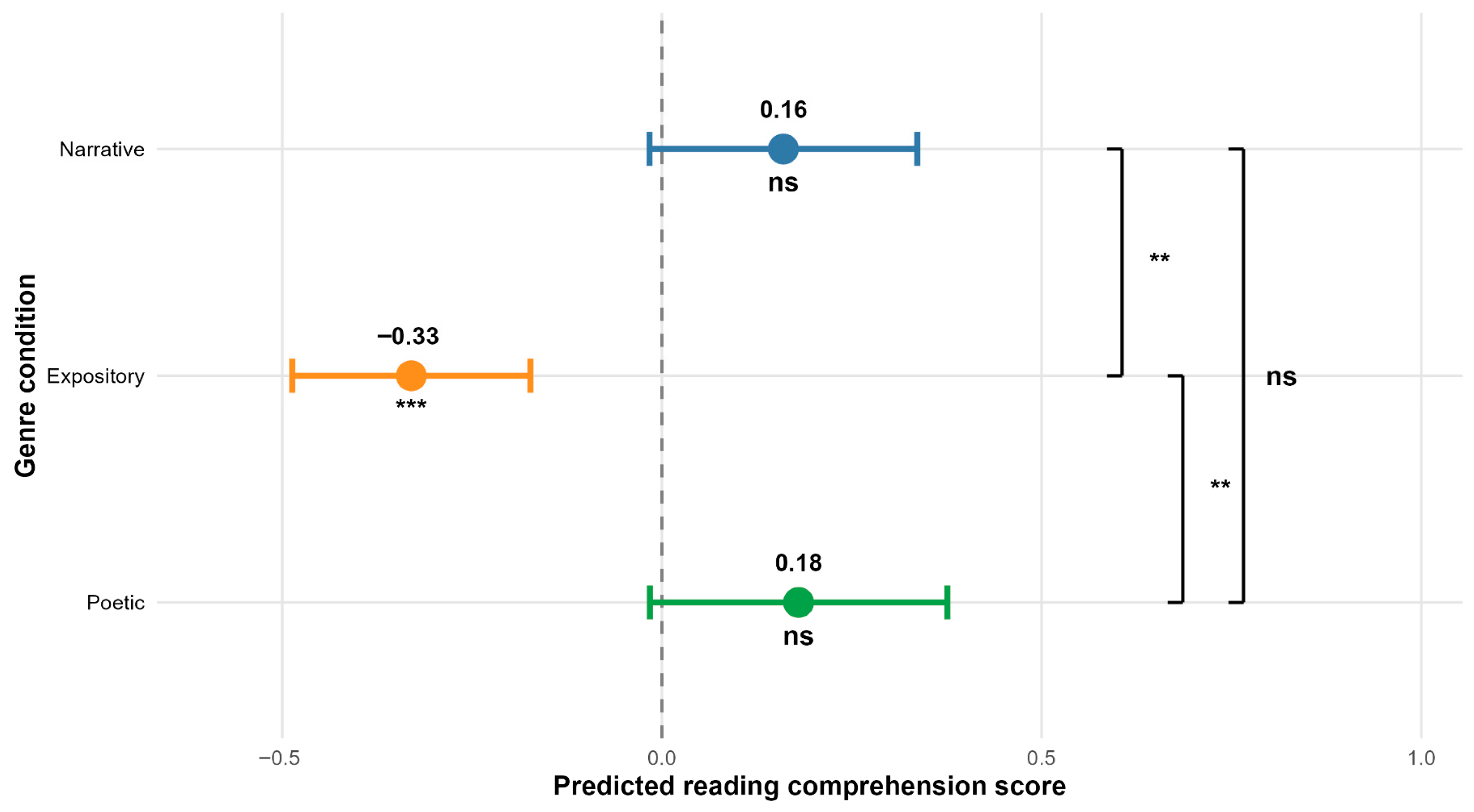 43]. This difference likely arises because narrative texts are organized around characters’ goals and a chronological sequence, which helps readers anticipate logical connections among ideas, whereas expository texts employ a more varied structure that hinders their processing; furthermore, the vocabulary of narrative texts is organized more simply—both in terms of word length and usage frequency—than that of expository texts.