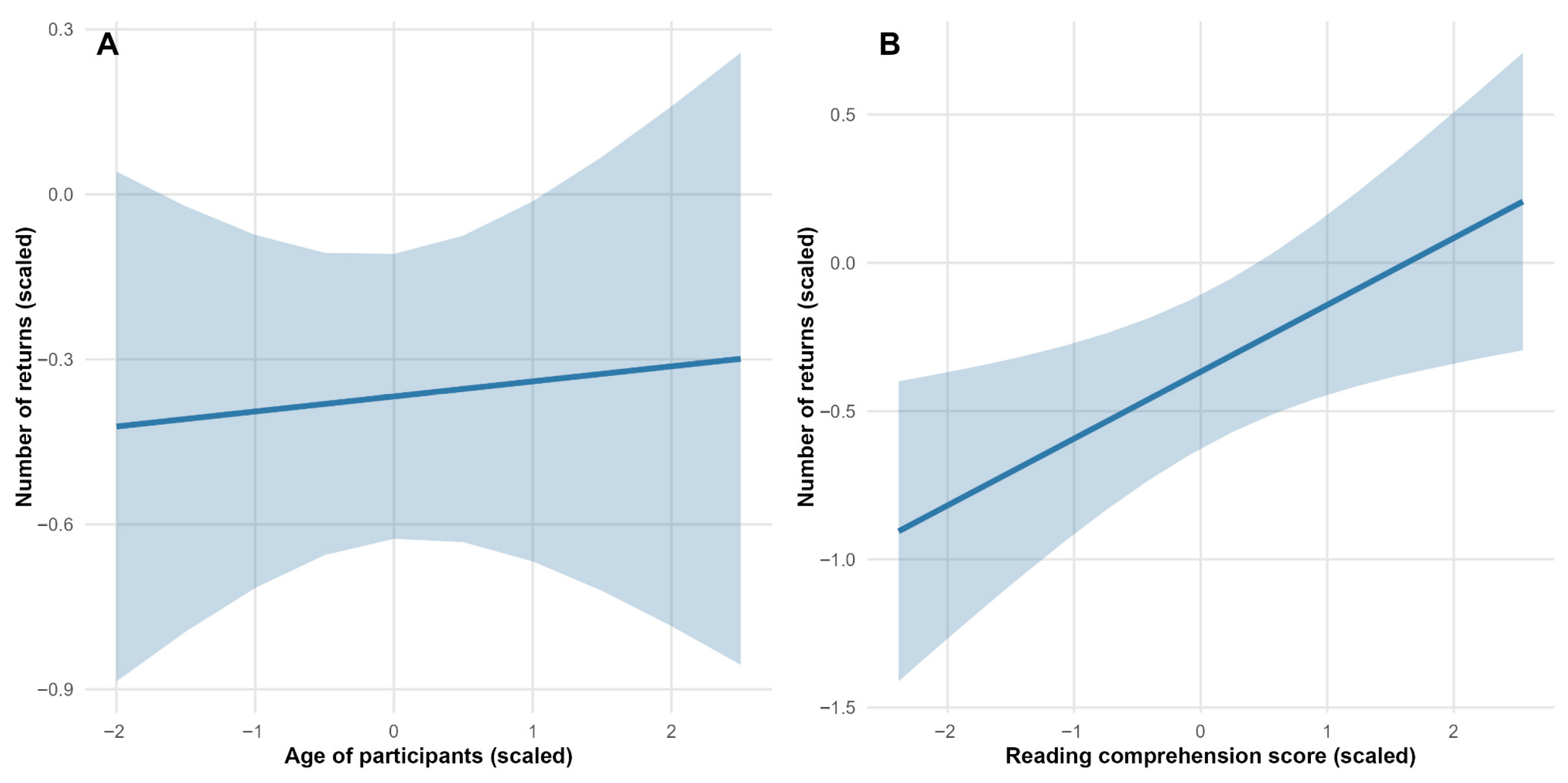 We found that a higher number of returns to the text for rereading predicted better reading comprehension. This result aligns with previous studies demonstrating that increased rereading reflects deeper text processing and leads to improved comprehension. Notably, blocking the opportunity to reread previously read text has been shown to negatively affect comprehension [