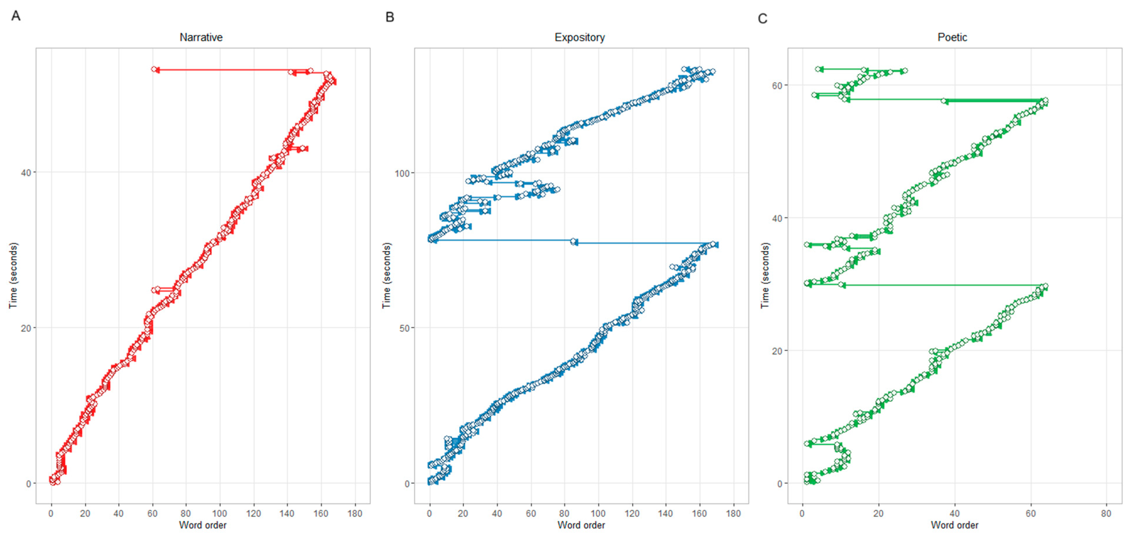 27]. This suggests that the adoption of regressive reading patterns may reflect attempts to overcome comprehension difficulties. However, previous studies have shown that there are differences in reading strategies between prose and poetry. Specifically, several studies have found a difference in reading time, with poetic texts being read more slowly, and in eye movement patterns, with more regressions when reading poetry as compared to prose [
