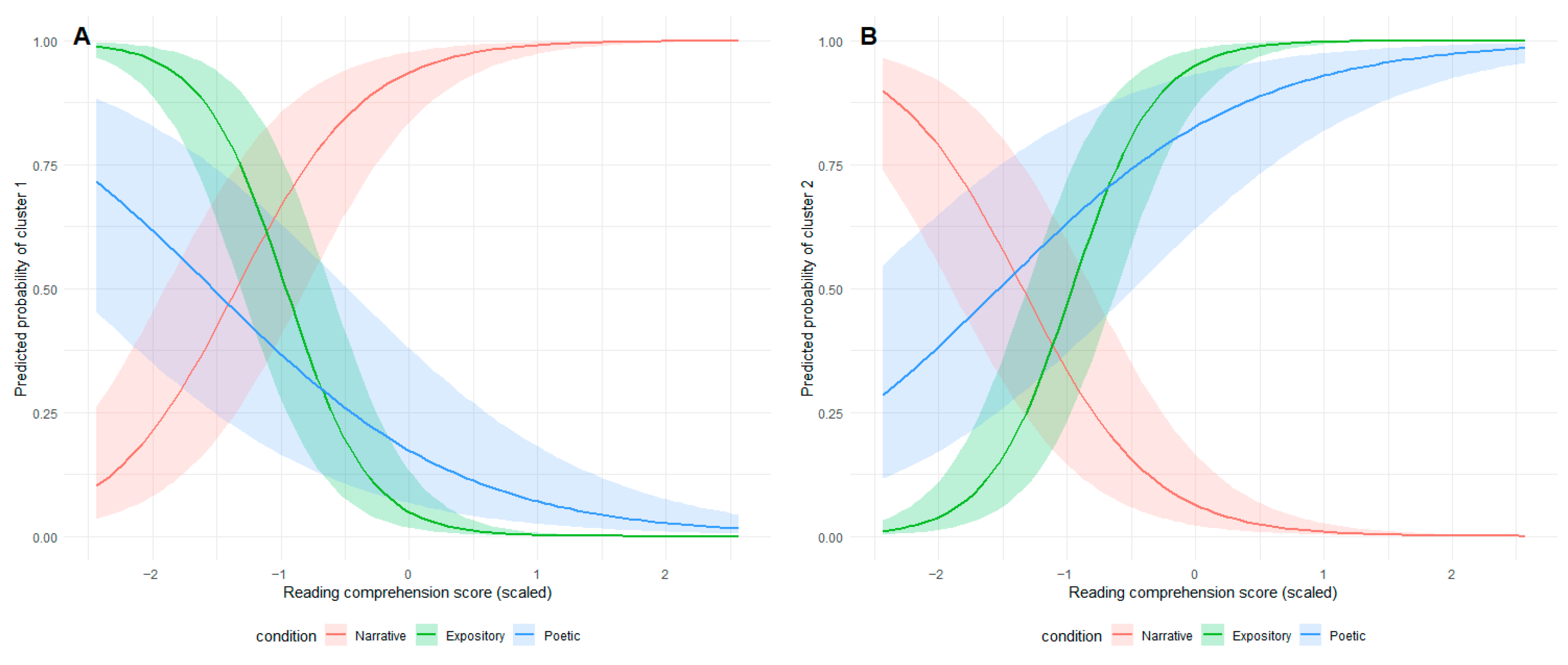 During the eye movement analysis, we identified two groups of scanpaths. Based on the combination of eye movement characteristics, we classified the reading patterns in the first group as the forward reading patterns and those in the second group as regressive reading patterns. This classification arose from the observation that the first group is represented by the reading patterns with fewer regressions with greater amplitude, along with higher reading and fixation rates. In contrast, the second group is characterized by patterns with a higher number of regressions with shorter amplitude and lower reading and fixation rates. Analyzing the relationship between these clusters and text genres, the level of reading comprehension and age, we found that the likelihood of employing forward reading patterns increases when reading narrative texts. Moreover, a higher comprehension score of such texts enhances this tendency. Interestingly, expository and poetic texts have a negative effect on the probability of using this pattern, and higher comprehension scores only increased this effect. Conversely, the use of the regressive reading pattern becomes more likely when reading expository and poetic texts and this tendency also grows with enhancing comprehension of these texts. In contrast, narrative texts exhibit the opposite effect, reducing the probability of using such patterns. Thus, following our first research question we confirm that reading patterns vary depending on the text genre. However, the answer to the second research question was less clear and contradicted initial expectations. Contrary to the hypothesis that increased comprehension would lead to an overall reduction in regressions, we found that comprehension modulated different reading patterns (forward or regressive reading pattern) depending on genre. Moreover, the overall trend, independent of genre, showed that increased reading comprehension generally increased the likelihood of the regressive reading pattern and decreased the likelihood of using forward reading patterns.