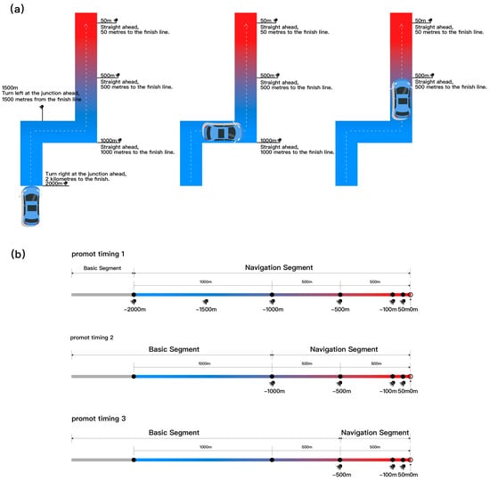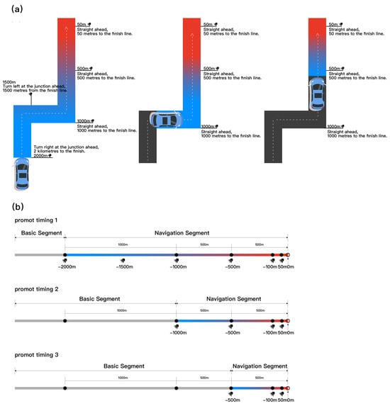 Schematic diagram of the experimental scene and prompt timing settings: (a,b) show the route scenario and prompt timing under the asynchronous condition. The three prompt lead distances were 2000 m, 1000 m, and 500 m.