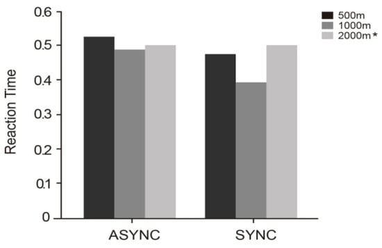 Further inspection of the mean reaction times by specific condition combinations revealed notable differences. As shown in Table 2 and Figure 5, the SYNC-1000 condition yielded the shortest reaction time (M = 0.39, = 0.11), indicating that issuing navigation instructions synchronously at a moderate distance (1000 m) most effectively facilitates rapid driver perception and response. Following this were SYNC-500 (M = 0.48, = 0.10) and SYNC-2000 (M = 0.50, = 0.09), suggesting that synchronous mode maintains high response efficiency even when prompt timing is earlier or later. On the contrary, asynchronous conditions showed slightly decreased performance. At equal distances, ASYNC-1000 (M = 0.49, = 0.12) was significantly longer than SYNC-1000. The ASYNC-500 condition recorded the longest reaction time (M = 0.53, = 0.09), implying that the combination of asynchronous prompt mode and delayed timing may interfere with the effective allocation of attentional resources, thereby impairing rapid response to navigation cues.