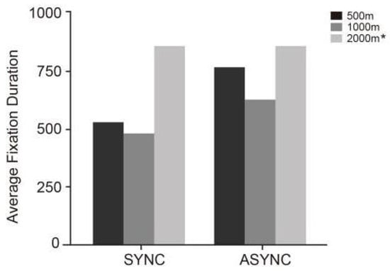 This figure illustrates the average fixation durations (in milliseconds) under six experimental conditions (SYNC-2000, SYNC-1000, SYNC-500, ASYNC-2000 *, ASYNC-1000, ASYNC-500), where “*” denotes a repeated value identical to the SYNC-2000 condition.