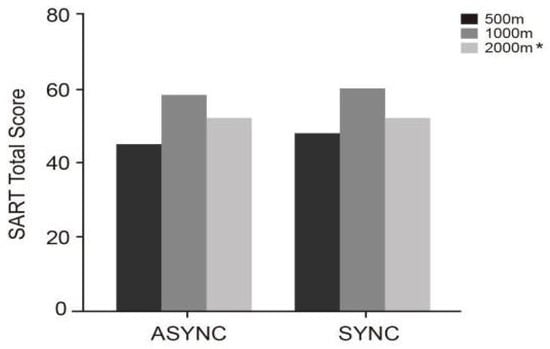 SART scores under six experimental conditions (SYNC-2000, SYNC-1000, SYNC-500, ASYNC-2000 *, ASYNC-1000, ASYNC-500). The “*” denotes repeated values equal to those in the SYNC-2000 condition.