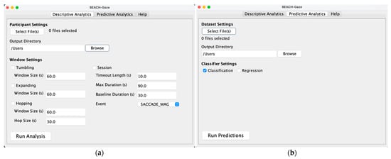 Figure 3 shows the GUI in BEACH-Gaze, highlighting the two main modules that generate descriptive (Figure 3a) and predictive analytics (Figure 3b). In the Descriptive Analytics tab, the researcher would first input the raw gaze files (either for one person or batched for a group of people) and select the desired output directory for the DGMs, then proceed to choose one or more of the windows to run analysis. As discussed in Section 3.3, timed and scheduled DGMs would be generated in a temporal fashion to capture sequential gaze measures detected at various stages. If none of the windows is selected, one summative file containing all DGMs for the entire duration is generated (instead of sequential DGM files at various time intervals). The researcher can then perform classification experiments in the Predictive Analytics tab, by providing the sequential DGM files (e.g., the output from Descriptive Analytics) and setting the type of classification models to apply (e.g., classification or regression) depending on the goal of the prediction.
