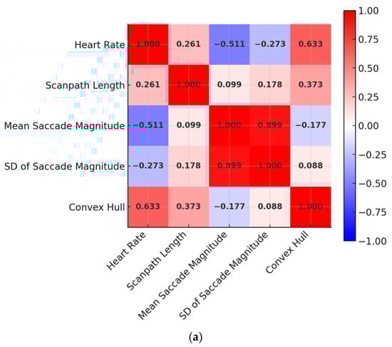 Heat map matrices showing correlation coefficient (r values) generated between pairwise DGMs and heart rates in evaluative studies using eye tracking: (a) r values generated for the above median group; (b) r values generated for the below median group.