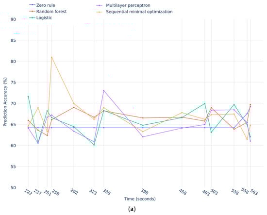 In another X-Plane 12 simulated study [] involving 50 pilots performing an Instrument Landing System (ILS) approach in cloudy conditions landing a Cessna 172 aircraft at the Seattle-Tacoma International airport, BEACH-Gaze enabled the comparison of seven different approaches to detect notable gaze events experienced by a pilot, such as elevated values of selected DGMs including saccade magnitude, saccade direction, pupil dilation, fixation duration, blink rate, stationary and transition entropy. The results showed the effectiveness of leveraging upon session windows to detect notable gaze collected at pivotal moments of a given task when predicting pilot performance. As shown in Figure 6a, pilot success and failure can be predicted as early as 3.7 min after the task began, with accuracies up to 80.92% (after 4.3 min) using fixation duration to detect notable gaze events experienced by the pilots. Several established classifiers without special configurations outperformed a baseline classifier that predicts the majority (e.g., zero rule), with the support vector machine classifier (e.g., sequential minimal optimization) producing predictions with higher accuracies.