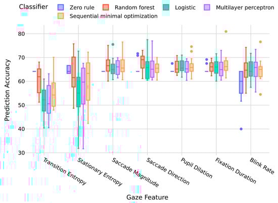 Compared to the zero rule classifier as a benchmark that predicts the majority class, consistently yielding an accuracy of approximately 64% with minimal variance across all features, all other classifiers showed varied levels of improvement in their prediction accuracies. Random forest demonstrated superior performance across most gaze features, particularly in stationary entropy, saccade magnitude, and blink rate. It achieved high median accuracy with relatively narrow interquartile ranges, indicating both effectiveness and stability. Sequential minimal optimization also performed robustly, especially when combined with fixation duration and pupil dilation. Logistic regression and multilayer perceptron exhibited feature-dependent performance, where the former exceled when combined with blink rate and pupil dilation, and the latter showed strong results when combined with saccade magnitude and fixation duration. Gaze features including saccade magnitude, pupil dilation, and fixation duration emerged as the most discriminative, enabling higher prediction accuracies across classifiers. Overall, all gaze features led to improved prediction accuracies across classifiers when compared to established gaze measures such as transition and stationary entropy.