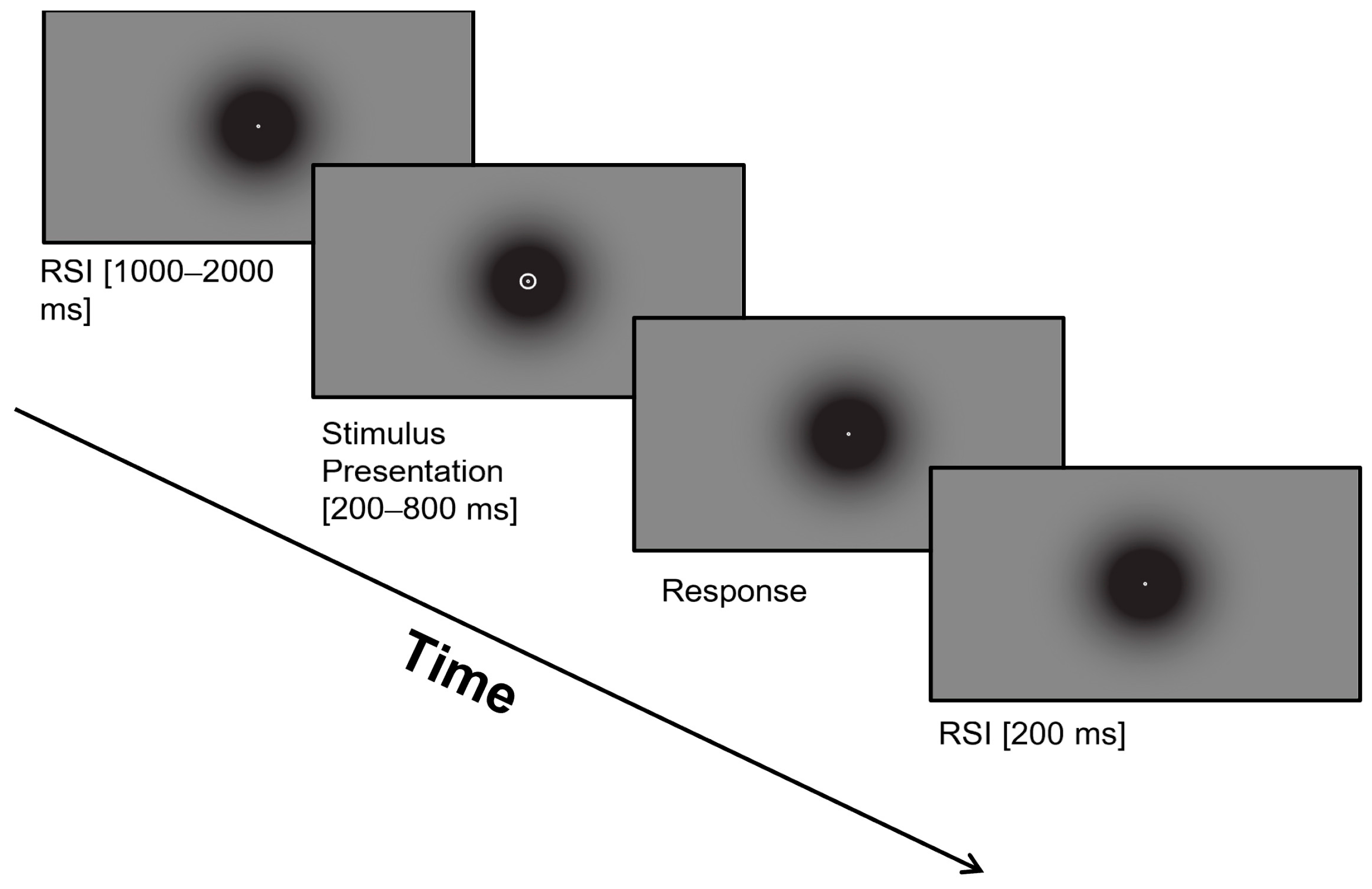The visual stimulus was a white circle displayed in the center of a 27″ LCD monitor (1920 × 1080 pixels; 60 Hz). The central area of the background was black and shifted to gray towards the sides of the screen to reduce contrast effects. The stimuli and experiment were programmed in OpenSesame 3.3 using the backend PsychoPy 2023.1.0 and the Python library PyGaze for stimulus presentation and eye-tracking, respectively [