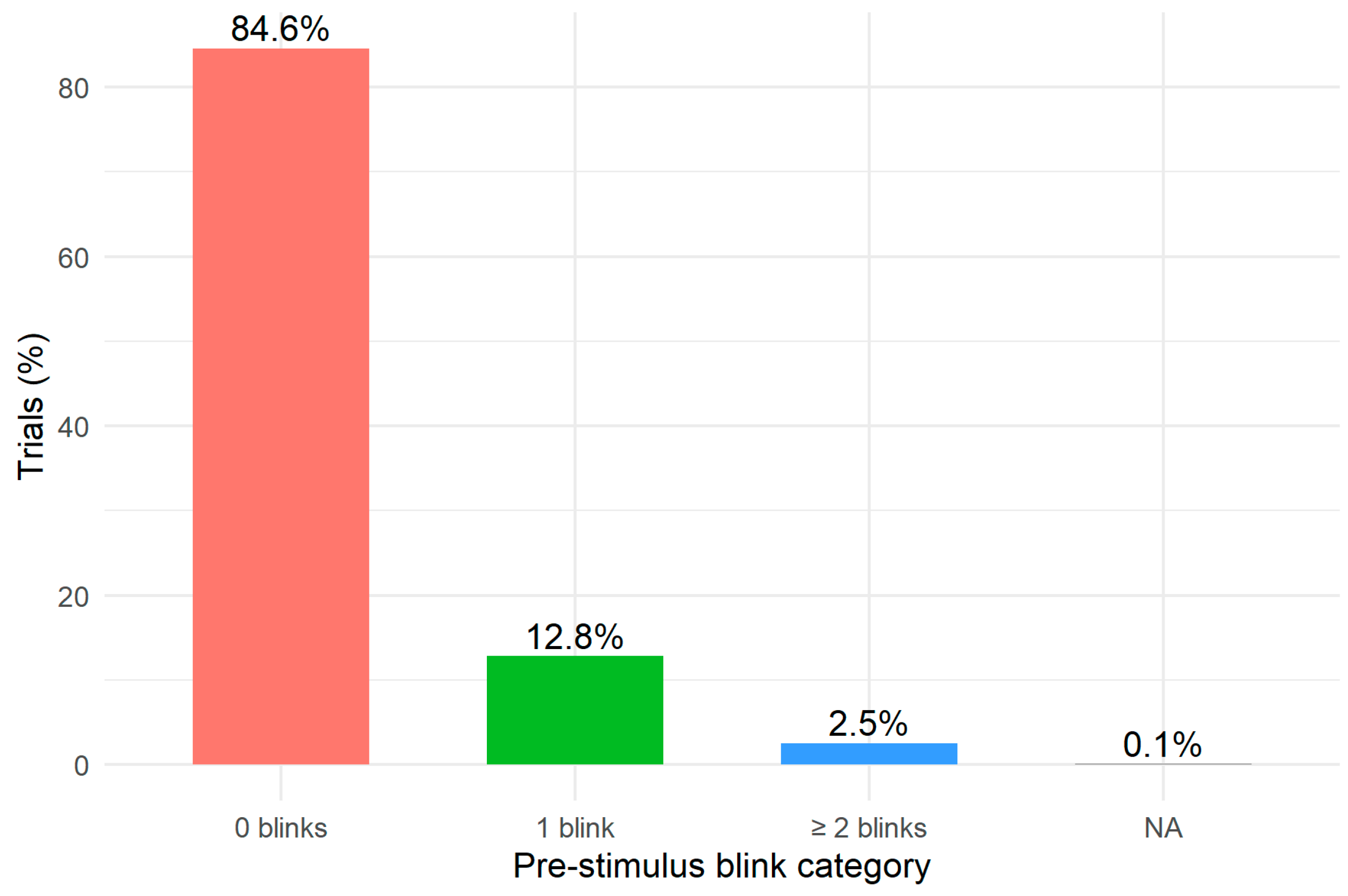 Figure 2 presents the distribution of trials across the three blink categories (0 blinks, 1 blink, ≥2 blinks). The majority of trials (84.6%) contained no pre-stimulus blinks, while 12.8% included a single blink and 2.5% included two or more blinks. This inspection confirms that blink events are relatively infrequent during the pre-stimulus interval but sufficiently represented for the inferential analysis.