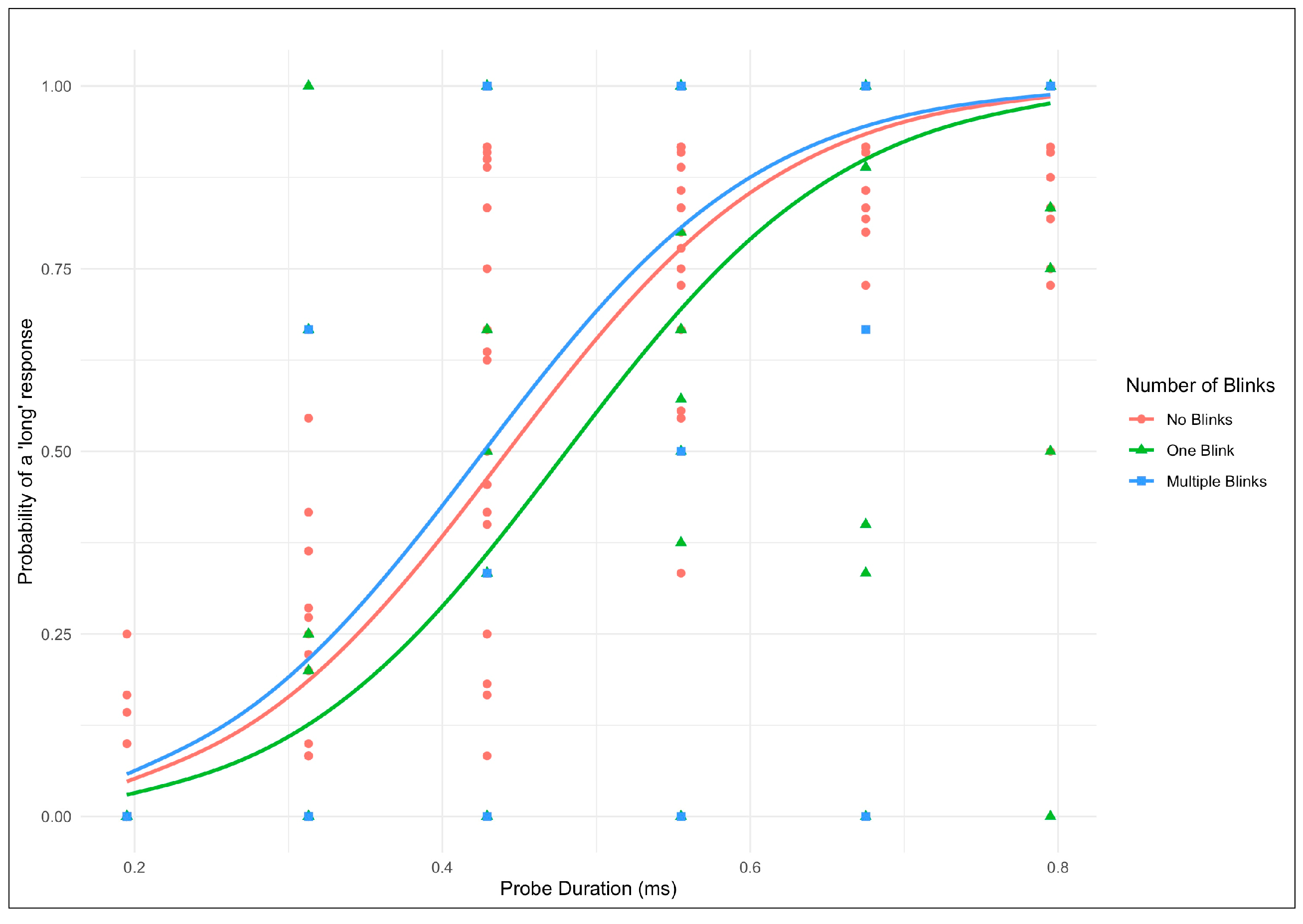 Figure 3 displays the predicted probability of giving a “long” response as a function of stimulus duration for each pre-stimulus blink category. The data points represent the observed mean responses across all participants, and the lines are the predicted probabilities derived from the GLMER model. The functions are plotted for each blink category represented by different colors, probe duration, and probability of giving a “long” response. The function reveals that a single blink before stimulus onset produces a downward shift, indicating a reduced probability of categorizing intervals as “long” compared to the no-blink baseline. This downward shift reflects the compression of perceived duration observed in the statistical analysis. In contrast, trials with two or more blinks show a pattern nearly identical to the no-blink condition, confirming the absence of additive effects.