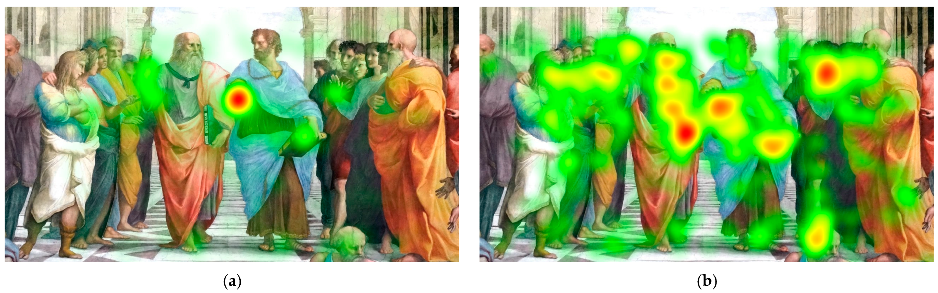 Figure 2. Group-level gaze heat maps for the task-relevant recursive point of interest: (a) art-education group and (b) non-art group..