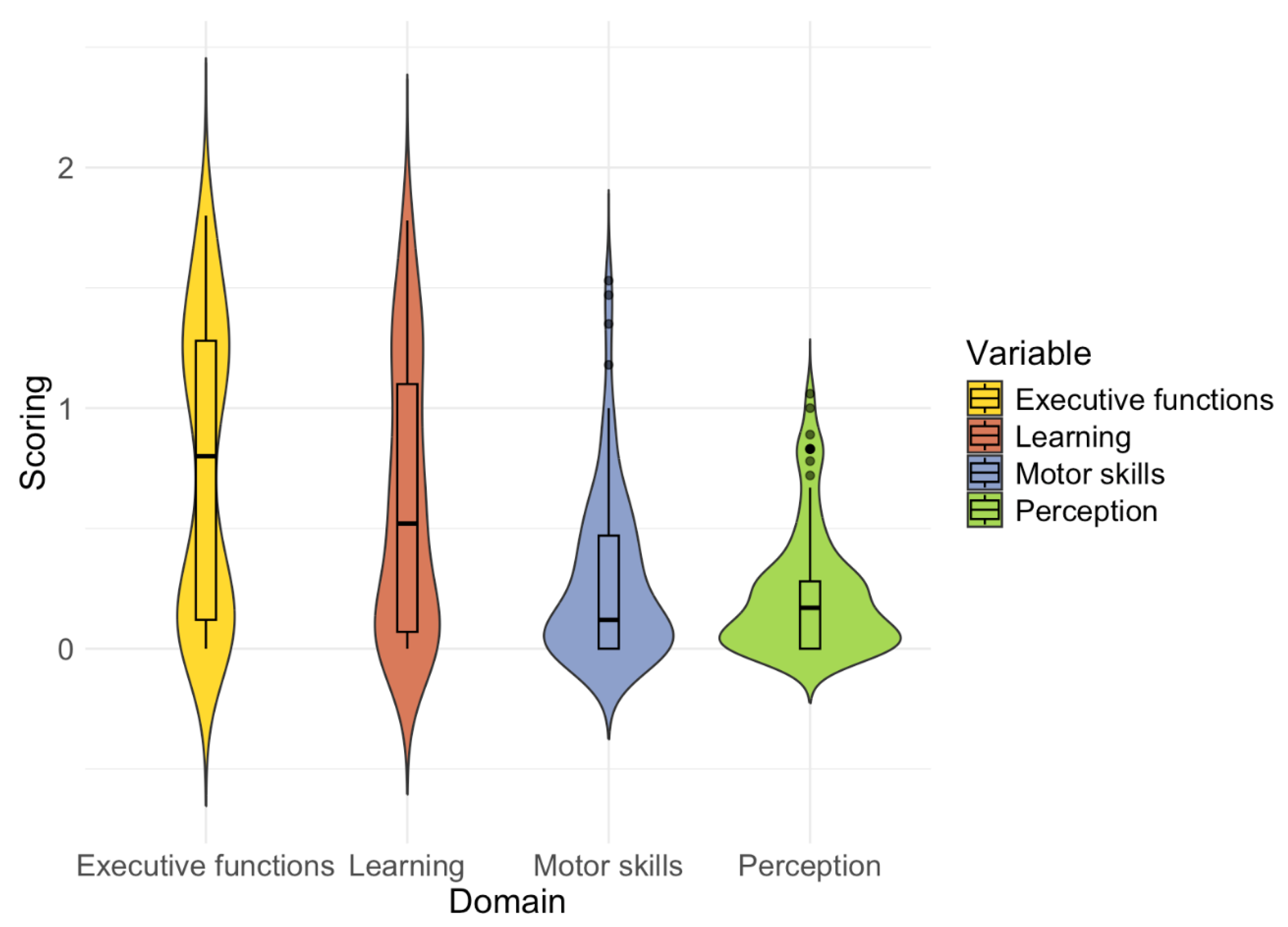 | Motor skills | −0.05 | [−0.35, 0.25] | −0.34 | 0.735 |