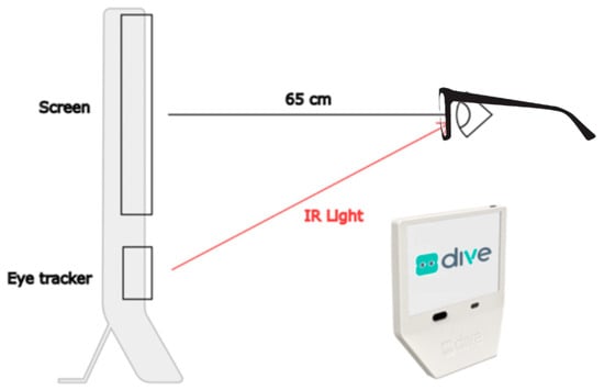DIVE diagram showing a side view of the device, the position of the patients’ eyes at 65 cm from the screen, and the infrared light path from the eye tracker to the eyes.