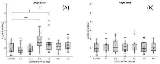 Boxplots showing the distribution of angle error values for each lens condition: (A) lenses with different dioptric powers and (B) lenses with different optical filters (* p-value < 0.05 and ** <0.001). In each boxplot, the black line represents the median, and the boxes indicate the interquartile range (IQR).