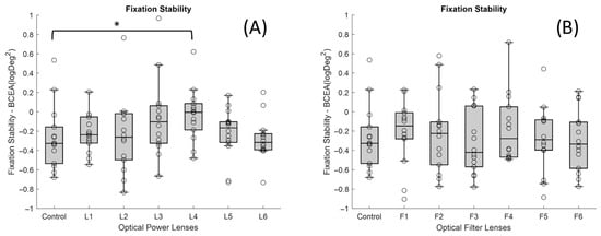 The fixation stability increased in most of the powered lenses (Figure 6A), although the only one that showed a significant difference (p-value < 0.05) with respect to the control lens (median of −0.33 logDeg2 and IQR 0.38) was the L4 (median of −4.83 × 10−3 logDeg2 and IQR 0.27). This effect suggests greater fixation instability with that lens. In contrast, ophthalmic lenses with filters (Figure 6B) maintained fixation areas similar to the control condition, indicating less gaze dispersion.