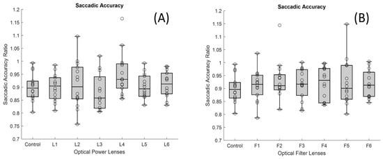 Boxplots showing the distribution of saccadic accuracy values for each lens condition: (A) lenses with different dioptric powers and (B) lenses with different optical filters. In each boxplot, the black line represents the median, and the boxes indicate the interquartile range (IQR).