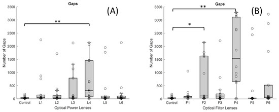 Boxplots showing the distribution of the number of gaps for each lens condition: (A) lenses with different dioptric powers and (B) lenses with different optical filters (* p-value < 0.05 and ** <0.001). In each boxplot, the black line represents the median, and the boxes indicate the interquartile range (IQR).
