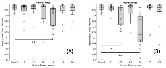 Boxplots showing the distribution of valid frame proportion for each lens condition: (A) lenses with different dioptric powers and (B) lenses with different optical filters (* p-value < 0.05 and ** <0.001). In each boxplot, the black line represents the median, and the boxes indicate the interquartile range (IQR).
