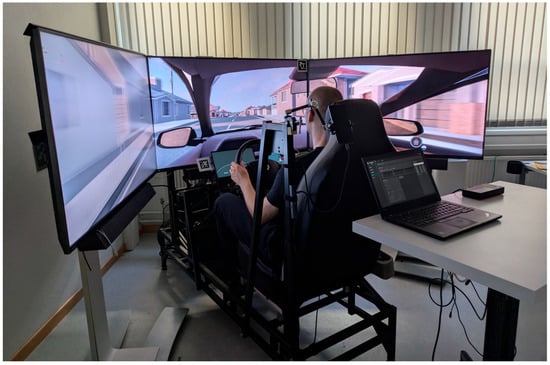 The experiment was conducted in the EcoSimLab electric vehicle (EV) driving simulator at the Institute of Multimedia and Interactive Systems, University of Lübeck (see Figure 1). The simulator modelled a Renault Zoe EV as the reference vehicle within the EcoDrivingTestPark environment [57]. This virtual test track consists of seven distinct driving scenarios, each designed to elicit energy-relevant driving maneuvers. The scenario duration averaged 77.5 s (SD = 10.0, range = 55.8–123.6 s), and the scenario complexity was deliberately varied to capture a wide range of operational ecodriving situations. The simulator hardware comprised three 55-inch and 120 Hz displays, arranged to create a 180° field of view. Participants sat in a car seat mounted on a Fanatec rig, including pedals and a wheelbase, combined with a compact steering wheel. Both steering wheel and pedals were equipped with force feedback to enhance realism. Simulation was implemented using BeamNG.tech (Version 0.25.0.0), a research-focused variant of the BeamNG.drive engine [58].