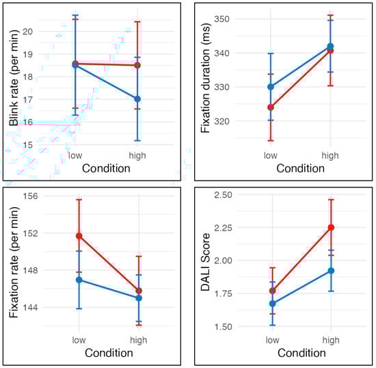 The figure displays the mean blink rate per minute (top left), fixation duration (top right), fixation rate (bottom left), and DALI scores (bottom right) across low and high conditions. Error bars represent ± one standard error of the mean. Red lines depict participants who drove the low-complexity condition first and then the high-complexity condition, whereas blue lines depict participants who experienced the high condition first and then the low condition.