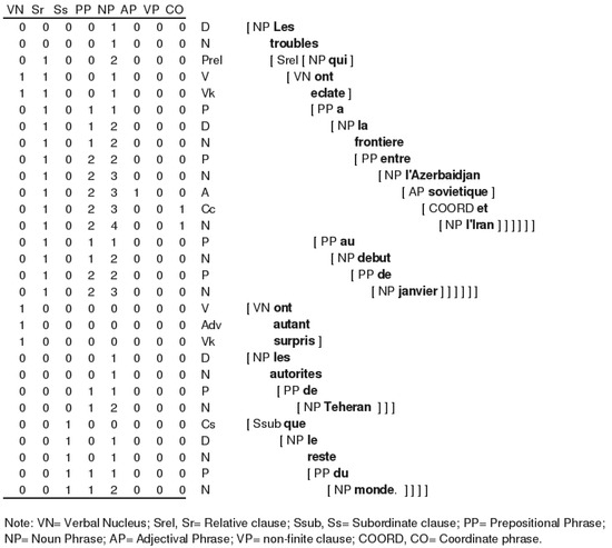 An example sentence, with its associated (simplified) syntactic description is presented in the right part of Figure 1. Each word was subsequently associated with a vector (left part of the figure), corresponding to the eight sub-structures that may or may not be open when an incoming word is integrated into the current tree (Verbal Nucleus: VN, Relative Clause: Sr , Subordinate Clause: Ss, Preposition Phrase: PP, Noun Phrase: NP, Adjectival Phrase: AP, non-finite Clause: VP, Coordinated Phrase: CO). For example, the preposition au (14th word) is associated with the vector <0 1 0 1 1 0 0 0> , meaning that a relative clause, a PP and an NP are still open at that point. The vector associated with the previous word corresponds to the phrase structure of the prior sentence fragment (i.e. the set of phrases that have been opened), at the moment when the preposition is encountered, that is, the phrase structure into which the preposition must be integrated. In this example, integrating a preposition into <0 1 0 2 4 0 0 1> produces <0 1 0 1 1 0 0 0>, corresponding to the fact that a new PP had to be opened, and that that new PP was attached as a complement of the verb of the relative clause, which involved closing three NPs, two PPs and one COORD. The first syntactic index used in the present study (SYN hereafter) corresponds to the number of cases in the corpus where <0 1 0 2 4 0 0 1> + P indeed produced <0 1 0 1 1 0 0 0>, divided by the total number of occurrences of <0 1 0 2 4 0 0 1> + P, whatever the post-integration vector (The syntactic descriptions used in the present study (Abeillé et al., 2003) were fully disambiguated, with only one attachment site provided at any given position. As a consequence, there was only one possible vector representation at any particular stage in sentences.). SYN thus provides an index of the degree of constraint exerted by the prior syntactic context upon the incoming word, given its syntactic category. If the prior sentence fragment is highly constraining, i.e., if there are only a few ways the incoming word can be integrated, most of the postintegration vectors will be identical to the one actually obtained, and the ratio will be close to 1. In contrast, if the incoming word can be integrated in many different ways, the specific post-integration vector obtained will be only one among many, and the ratio will be close to 0. In other words, SYN refers to how many possible ways there are (based on the Treebank) to integrate the incoming word. The higher the SYN ratio, the greater the certainty about how that word would be integrated to the current incomplete tree, with certainty ranging from 0 to 1.
