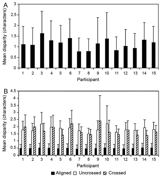 (A) The mean fixation disparity (for both crossed and uncrossed fixations) measured in characters for each participant with error bars (+1 SD). (B) The mean disparity in characters for aligned, uncrossed and crossed fixations for each participant with error bars (+1 SD).