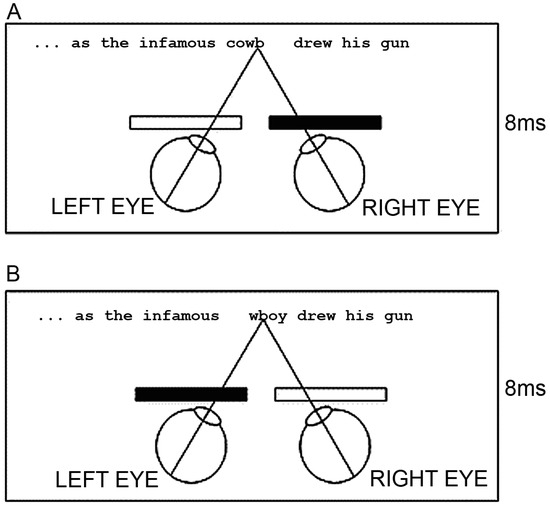 Schematic Representation of the Shutter Goggle Arrangement under Congruent Dichoptic Conditions to Each Eye. This arrangement shows the two alternating presentations of the target word cowboy in part of its sentential frame under congruent dichoptic conditions to each eye. (A) The initial portion of the word was available to the left eye, but blocked to the right eye. (B) The latter portion of the word was available to the right eye, but blocked to the left. The two-letter overlap (wb) anchored the word halves in the vertical plane.