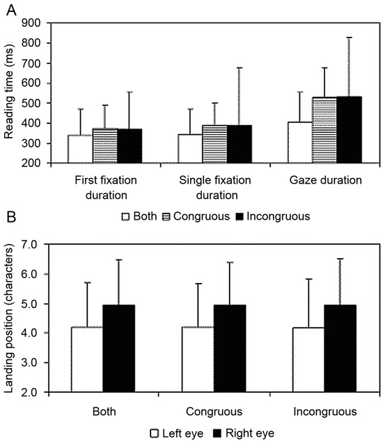 Mean Reading Times and Saccade Landing Positions on the Target Word for Each Condition. (A) Mean reading times (+1 standard deviation) for the target word under congruent and incongruent dichoptic viewing conditions, and the control condition where the whole word was presented to both eyes. First fixation duration is the duration of the first fixation on the word, regardless of whether the word was refixated. Single fixation duration is the duration of the first fixation on the word contingent on the participant not refixating the word. Gaze duration is the sum of all the fixations on the word until the participant made a saccade to another word. (B) Mean saccadic landing positions (+1 standard deviation) on the target word for the left eye and the right eye under congruent and incongruent dichoptic viewing conditions, and the control condition where the whole word was presented to both eyes.