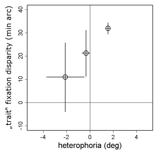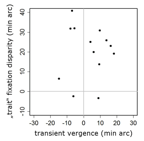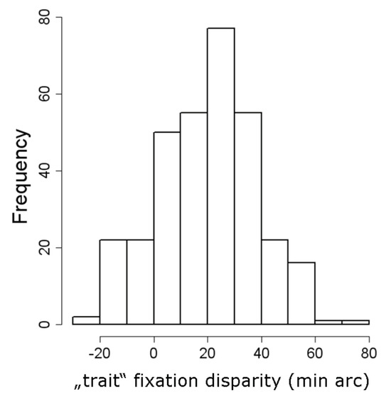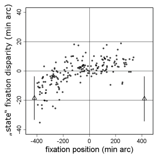 In our study, 14 subjects read 60 sentences from the Potsdam Sentence Corpus twice (viewing distance: 60 cm), while eye movements were measured with the EyeLink II. We analyzed fixation disparities for complete sentence replications (N = 388). After subtracting the average fixation disparity of each sentence from each observation (which gave the “state” fixation disparity), 99% of all remaining fixation disparities were aligned, i.e. smaller than one character width (20 min arc)—depending mostly on incoming saccade amplitude and fixation position. Additionally, we measured the heterophoria for each subject during calibration and found a qualitative relationship between average, individual measures of fixation disparity (“trait” fixation disparity) and heterophoria, after dividing the sample in 3 groups of esophore, exophore and orthophore subjects. We showed that the magnitude of “trait” fixation disparity was biased by the direction of heterophoria: the more eso the heterophoria, the more eso the average sentence fixation disparity. In sum, despite a large “trait” fixation disparity (in the range of −6.6 to +33.6 min arc), “state” fixation disparities within a sentence were on average −0.9 (±8.7) min arc and, thus, as precise as needed, i.e., within the expected extent of Panum’s area. Full article