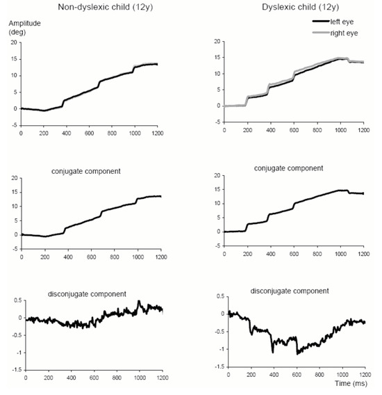 Smooth pursuit (SP) was explored in dyslexics and non-dyslexics. Dyslexic children show similar gain of SP, and number and amplitude of catch-up saccades (CUS) as non-dyslexic children. The quality of binocular coordination is good for both groups; the only significant exception is for pursuit to the right for both smooth phase and CUS; dyslexics show higher disconjugacy. Decrement of binocular control during rightward pursuit only could reflect immaturity of oculomotor learning mechanisms needed to optimize binocular coordination for all directions. Yet, these observations need to be confirmed in a larger population including older children and compared with other populations, e.g., with right-to-left reading. Full article