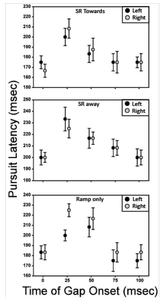 Figure 7 shows the effect of gap placement versus pursuit latency. The black symbols represent trials in which the initial direction of the target motion was to the left, and the gray symbols represent trials in which the initial direction of target motion was to the right. For the six conditions plotted, gaps in target-motion visibility that started 25 and 50 ms after initiation of target motion lead to an increase in pursuit latency relative to both the nogap condition and conditions with later gap onsets.