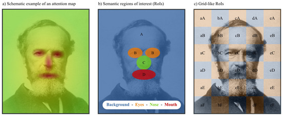 Alternative ways to determine the similarity between eye movement sequences. a) Fixation density can be plotted as an attention map (Caldara & Miellet, 2011). Correlations between attention maps can be used as a measure of similarity. b,c) An image can be divided into regions of interest (RoIs) based on the semantic properties of the image (b) or based on a grid (c). Using these RoIs, eye movement sequences can be re-coded as character strings, and a string edit distance can be used as a similarity measure (Cristino et al., 2010; Levenshtein, 1966; West et al., 2006).