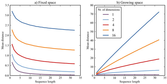 The mean distance between two randomly generated sequences as a function of dimensionality, sequence length, and spacing. a) Values were randomly chosen between 0 and 1. b) Values were randomly chosen between 0 and X, were X is equal to the sequence length.