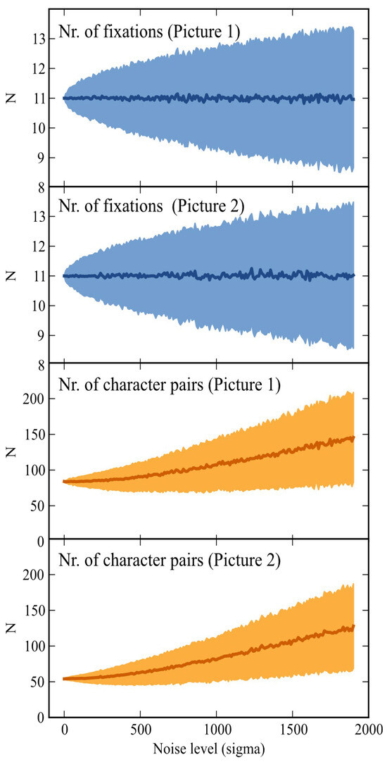 Descriptive statistics (the shaded area indicates the standard deviation) for the artificial eye movement data. Whereas the average number of fixations is relatively constant across noise levels and the two pictures, the average length of the character strings increases. This is because the length of the character strings also reflects the duration of the fixations.