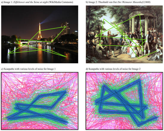 a,b) Two images were used to generate realistic, artificial eye movement data using the iLab Neuromorphic vision toolkit (Itti & Koch, 2000; Itti et al., 1998). c,d) Different levels of noise (indicated by different colours) were added to the eye movement sequences from (a,b).