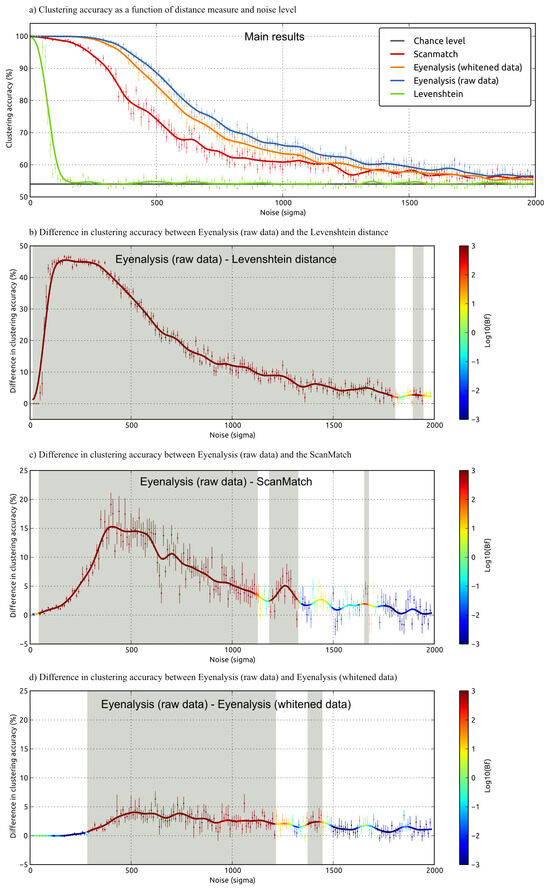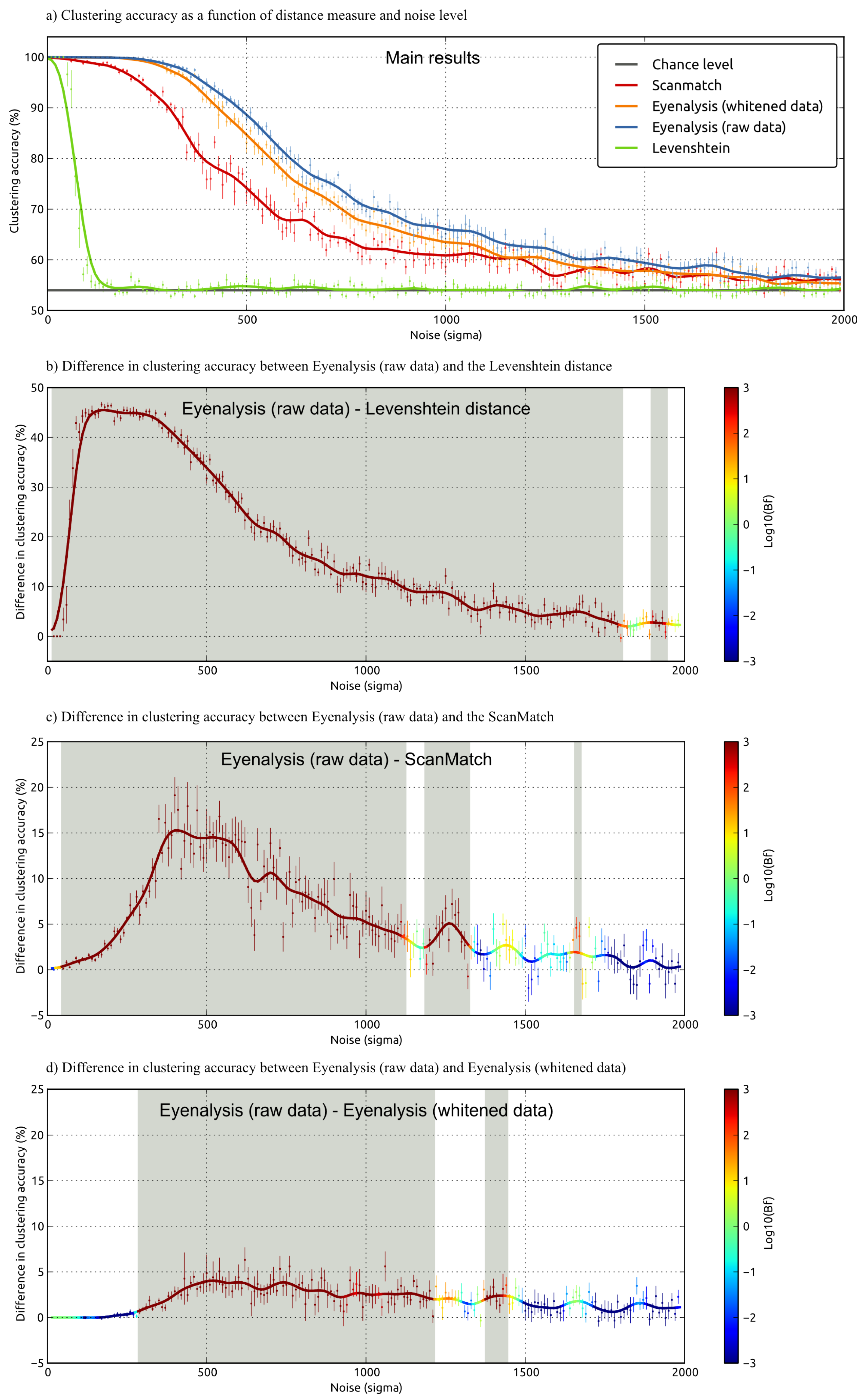 Results of the experiment. a) Clustering accuracy as a function of method and noise level. b,c,d) The difference in clustering accuracy between Eyenalysis (raw data) and the Levenshtein distance (Levenshtein, 1966) (b), Scan-Match (Cristino et al., 2010) (c), and Eyenalysis (whitened data) (d). Error bars represent the standard error. In (b,c,d) the colour coding reflects the Bayes factor (Bf), using a Bayesion sliding window (The Bayes factors (Bfs) shown in Figure 7b,c,d are calculated using the following 'sliding window' technique: First, a Bf was calculated for each data-point, assuming a uniform distribution for the expected difference, with a lower bound of 0% and an upper bound of 46% (i.e., 100% - chance level). Next, the Bfs were smoothed using a Hanning window of width 70). Data points where Bf > 100 (i.e., ‘decisive evidence’ for a difference, cf. Wetzels et al., 2011) are marked with a light-gray background. All lines have been smoothed using a Hanning window of width 70.