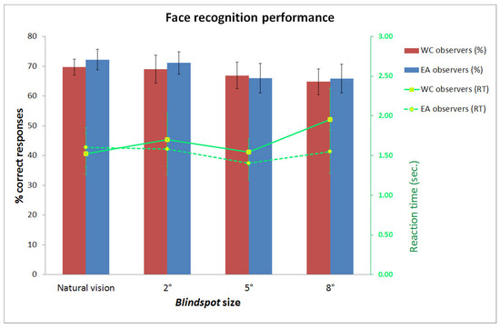 2 (Culture of Observer: Western or Eastern) x 4 (Blindspot size: Natural-vision, 2, 5, 8 degrees) ANOVAs revealed a decrease of face recognition accuracy (F(3, 84)=4.32, p<0.01) and a trend to slower response times (F(3, 84)=2.71, p<0.06) as the Blindspot size increased (Figure 1). Western Caucasian and East Asian observers were equally accurate and fast at recognizing faces (Fs (1, 28) < 1). The interaction between the Culture of the observer and the Blindspot size factors, for accuracy (F(3, 84)=.33, p=.80) and response times (F(3, 84)=1.93, p=.13), failed to reach significance.