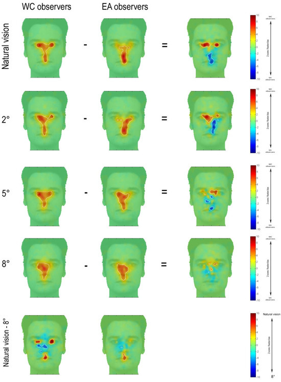 Figure 2 shows fixation maps and the regions significantly fixated above chance level according to iMap (white contours) for EA and WC observers and for Natural-vision, 2°, 5° and 8° Blindspot during face recognition. The difference maps reveal the well-established central bias for Easterners (in blue in the difference map) and eye-mouth bias for Westerners (in red in the difference map) in the Natural-vision condition. These cultural fixation biases progressively disappear for larger Blindspots, and in the 8° Blindspot condition, there is no consistent difference between the fixation patterns for WC and EA observers. Crucially, the contrast between the most extreme Blindspot conditions (Natural-vision versus 8°) revealed that Westerners dramatically changed their fixation pattern while Easterners adopted a much more constant exploration strategy (see last row in Figure 2). Easterners keep looking in the middle of the face for Natural-vision or any Blindspot size while the preferred eyes-mouth fixation locations for Westerners in Natural-vision migrate toward the center of the face with increasing Blindspot size.