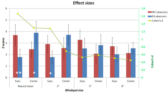 These statistical analysis revealed significant interactions for those factors in the Natural-vision and 2° conditions (F(1, 28) = 10.61, p<.003 and F(1, 28) = 5.45, p<.03 respectively). WC observers spent significantly longer fixating the eye region than EA observers in the Naturalvision and 2° conditions as revealed by independent twotailed t-tests (t(28) = 3.25, p<.005 and t(28) = 3.37, p<.03 respectively). In contrast, EA observers fixated longer on the center of the face than WC observers in the Naturalvision condition (t(28) = 2.40, p<.03 ; only a trend was observed in the 2° condition t(28) = 1.78, p=.08). Cultural fixation biases on facial features were reliable and robust, as highlighted by the large magnitude of Cohen’s d effect size values for the significant effects (see Figure 3).