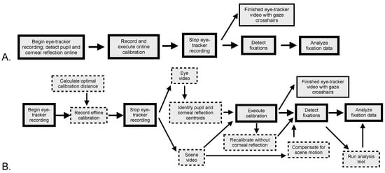 The eye-tracker’s calibration calculations can be completed online or offline. With an online calibration, the eye-gaze correspondence is entered into the eyetracking software as the participant views each calibration point. Online calibrations immediately take effect, and are used for all subsequent portions of the recording until another calibration occurs. As soon as an online calibrated recording is finished, the system outputs a single video with overlaid gaze crosshairs. In contrast, with an offline calibration, synchronized eye and scene videos are recorded as each calibration point is viewed, but the gaze calculations are not conducted during the recording. The initial output of such recordings is therefore two separate eye and scene videos; the videos are combined and gaze is calculated during a subsequent calibration stage.