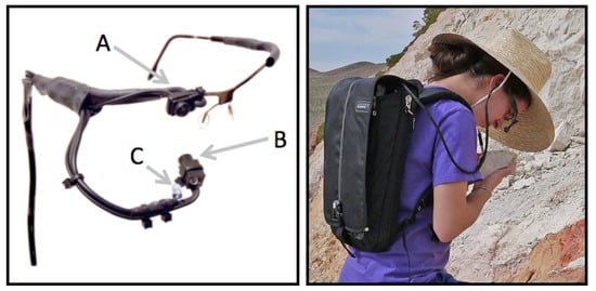 The geology study requires that the tracker be suitable for long recordings and that it not restrict movement as the observers walk around the environment, examine rock samples, and take lecture notes and scene sketches. We use a video-based monocular recording system developed by Positive Science, in which cameras monitoring the eye and the scene are mounted to a lightweight set of eyeglass frames (design described in Babcock & Pelz, 2004). The eye camera (labeled B in Figure 2) sits on an adjustable arm positioned below the right eye and adjacent to a nearinfrared emitting diode (IRED) (labeled C in Figure 2). This equipment is visible to participants, typically obstructing <1% of the right eye’s peripheral field of view, though participants report acclimating to its presence quickly. The scene camera (labeled A in Figure 2) is mounted above the right eye, recording a color video that moves with the participant’s head and body. Wiring from the headgear connects to an ultralight laptop that the participant carries in a backpack (Figure 2, at right).