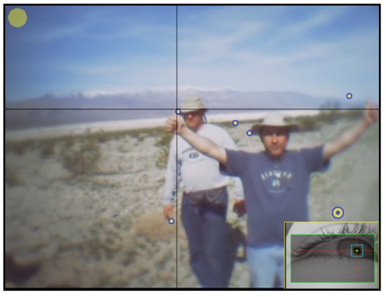 Moving target method of five-point calibration. Observers who were tracked outdoors followed a partner’s moving thumb, which paused at positions that create a fivepoint calibration (indicated by overlaid circles).