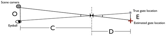 Calculating parallax error. The amount of parallax error (E) for a mobile eye-tracker can be calculated for any distance from the calibration plane (D), when the distance between the calibration plane and the observer (C) and size of the offset between the scene camera and eyeball (O) are known. Geometrically, E/D = O/C, and therefore E = OD/C. This formula holds regardless of whether gaze is being calculated at distances beyond the calibrated plane, or at distances between the observer and the calibrated plane.
