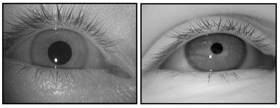 Clear images of the pupil and corneal reflection, captured from a wearable eye-tracking system indoors (left) and outdoors (right).